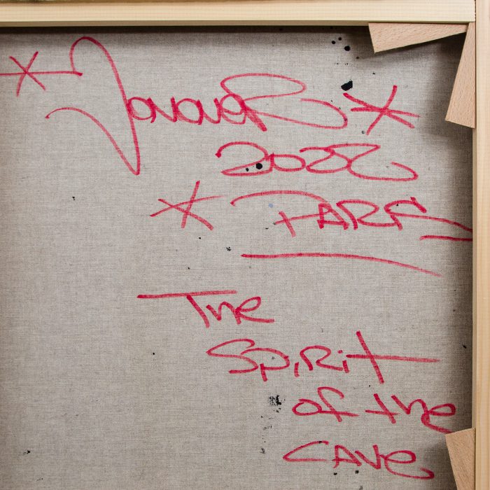 Spirit of the Cave de JonOne est une peinture acrylique et encre sur toile titrée, datée et signée par l’artiste. Elle est accompagnée d’un certificat d’authenticité et mesure 120 x 120 cm