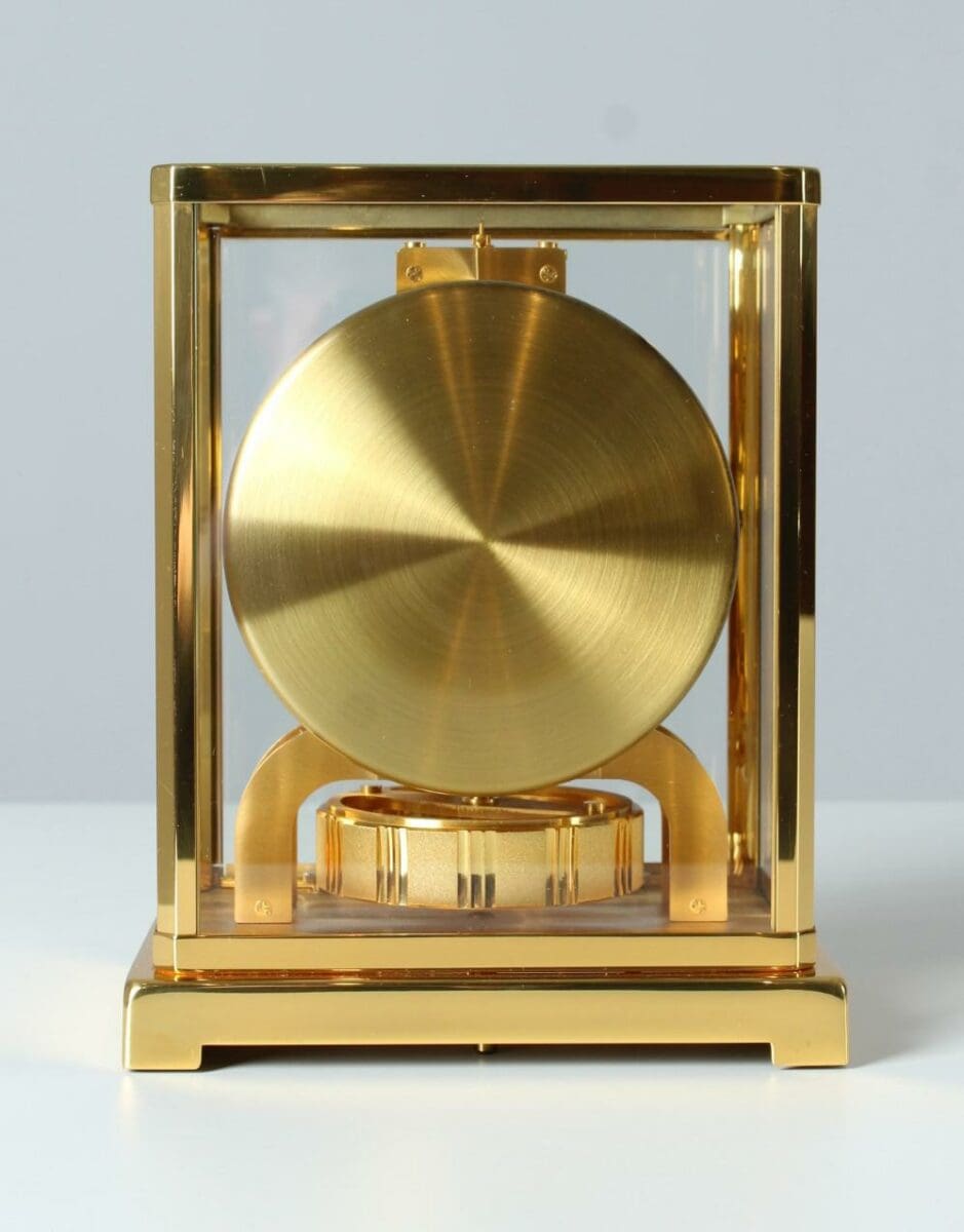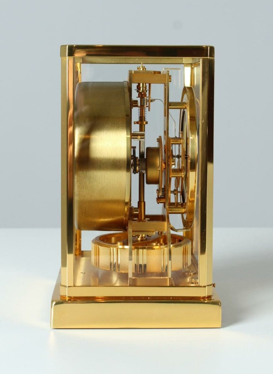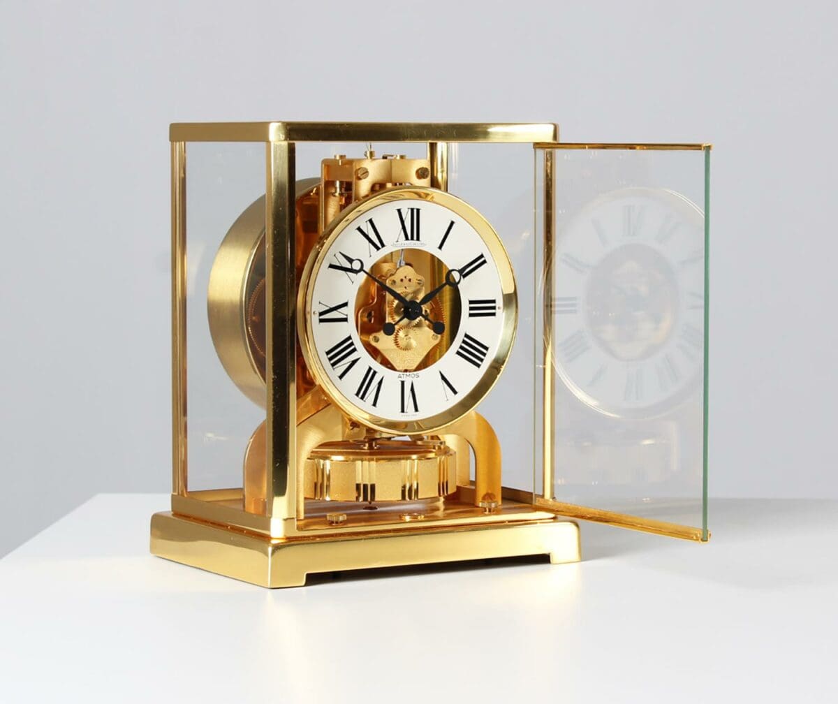 Cette horloge Atmos de Jaeger LeCoultre est une magnifique œuvre d’art, avec son métal doré et son verre sur cinq faces. Le mouvement perpétuel est basé sur les différences de pression atmosphérique.