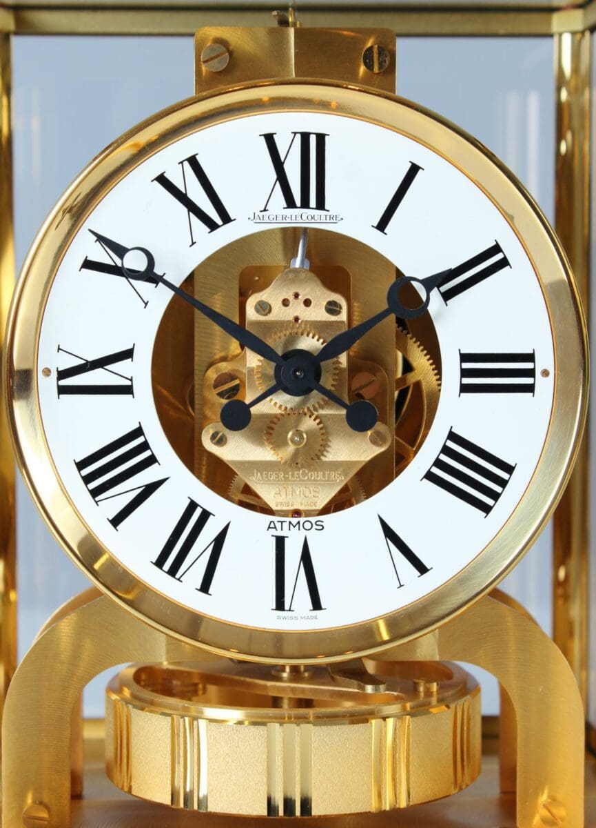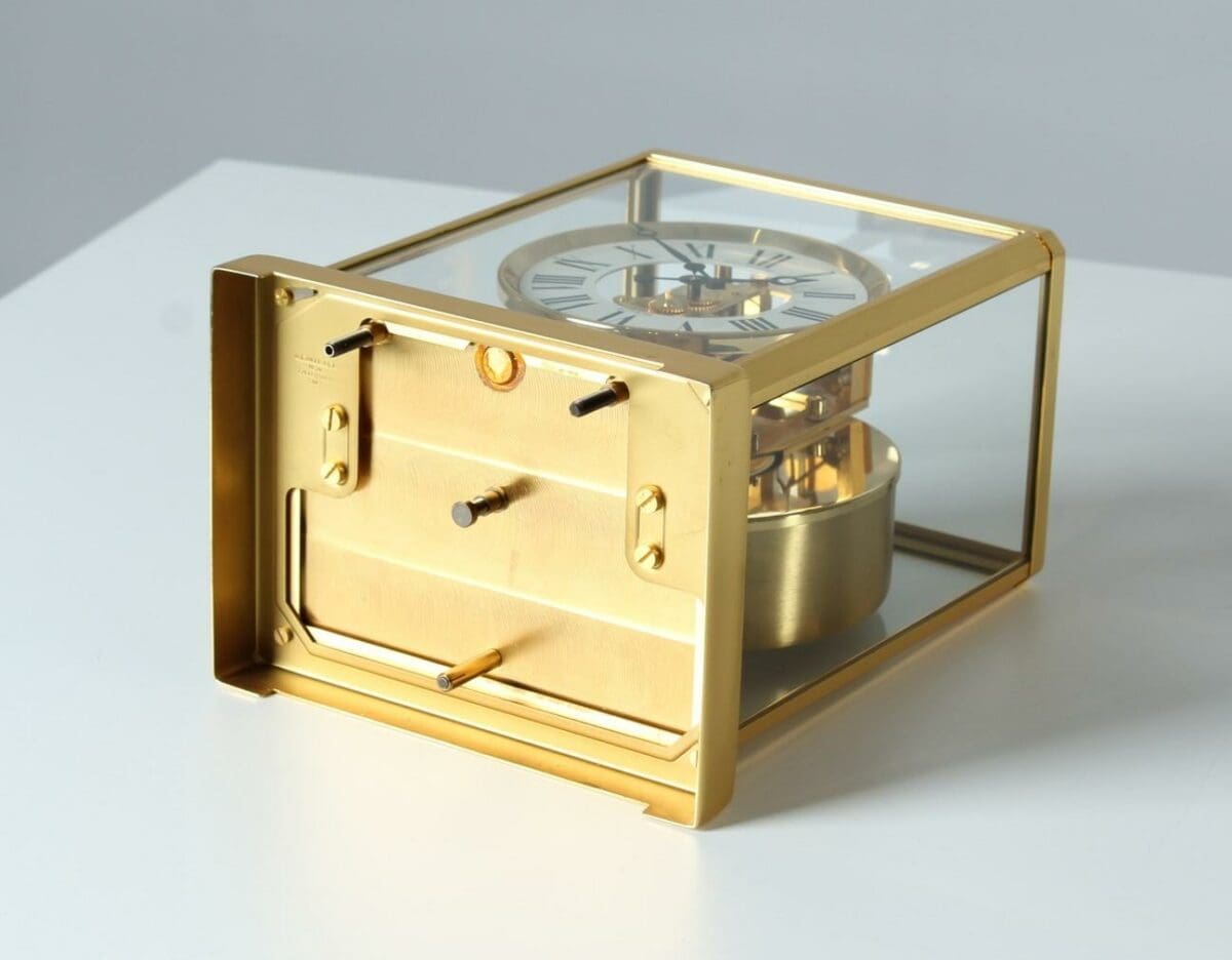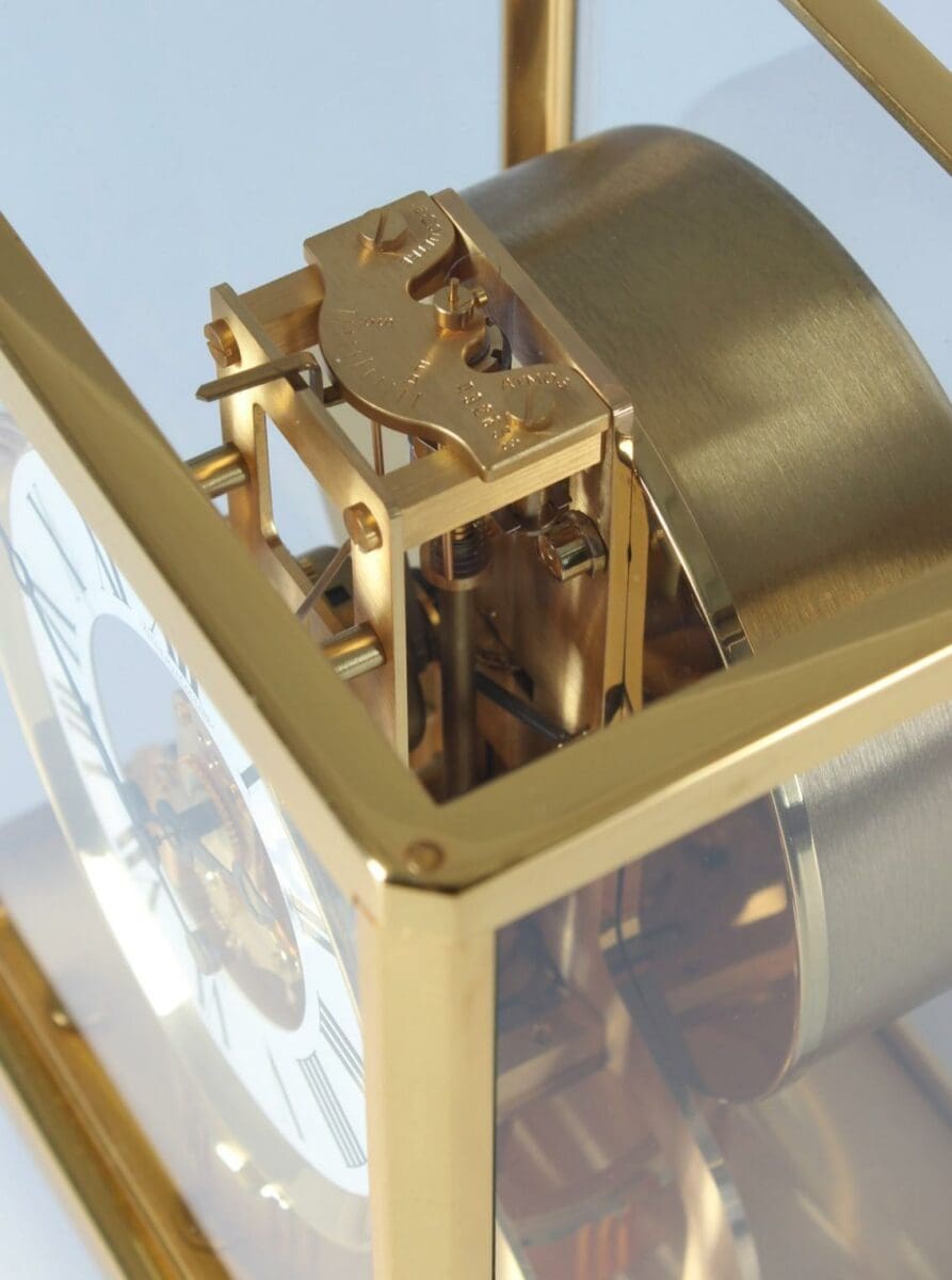 Cette horloge Atmos de Jaeger LeCoultre est une magnifique œuvre d’art, avec son métal doré et son verre sur cinq faces. Le mouvement perpétuel est basé sur les différences de pression atmosphérique.