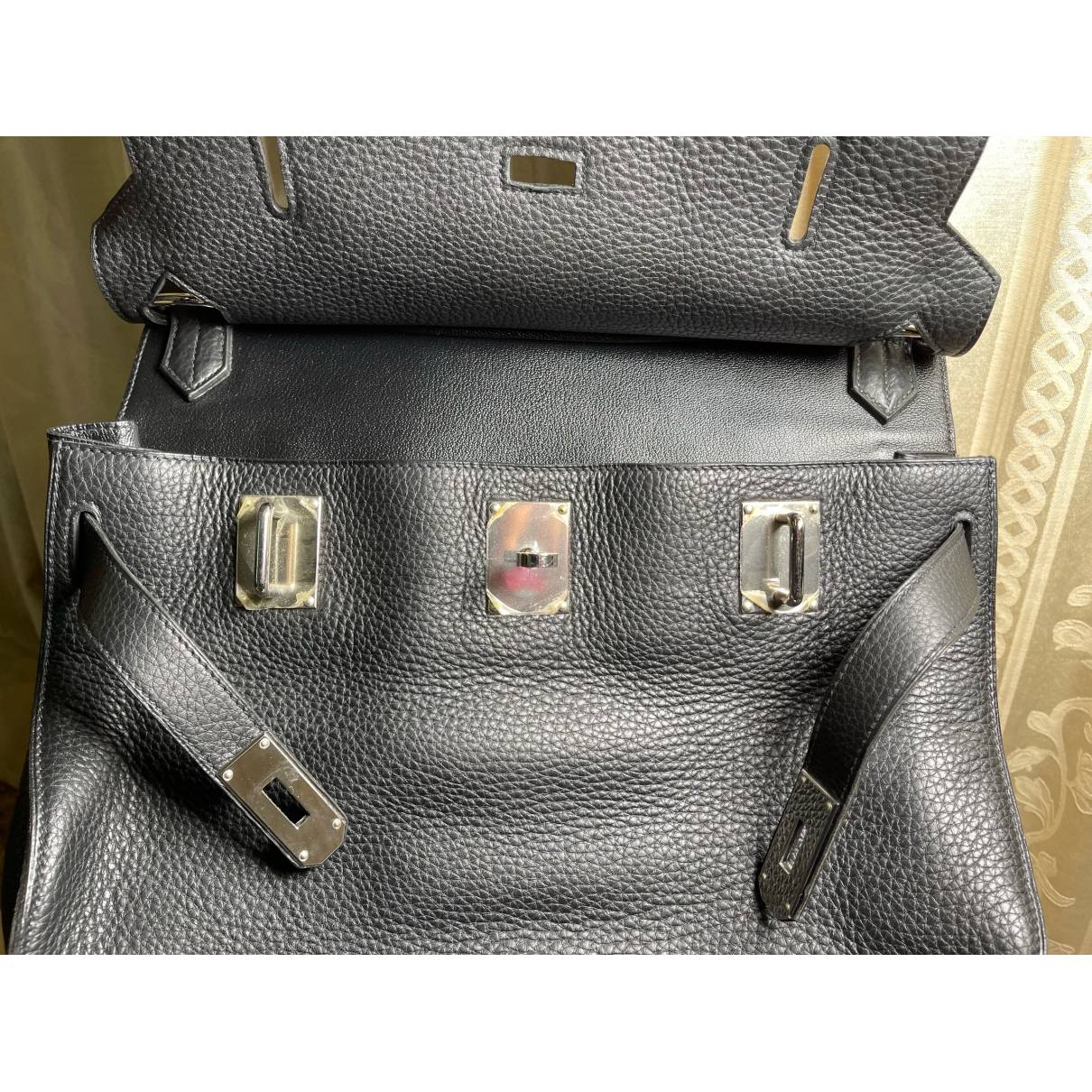 Les autocollants de la quincaillerie intérieure sont toujours présents, une autre preuve de l’excellent état de conservation du sac. Chaque détail de ce sac Hermès est pensé pour la fonctionnalité et l’élégance, y compris la quincaillerie argentée qui contraste joliment avec le cuir noir du sac.