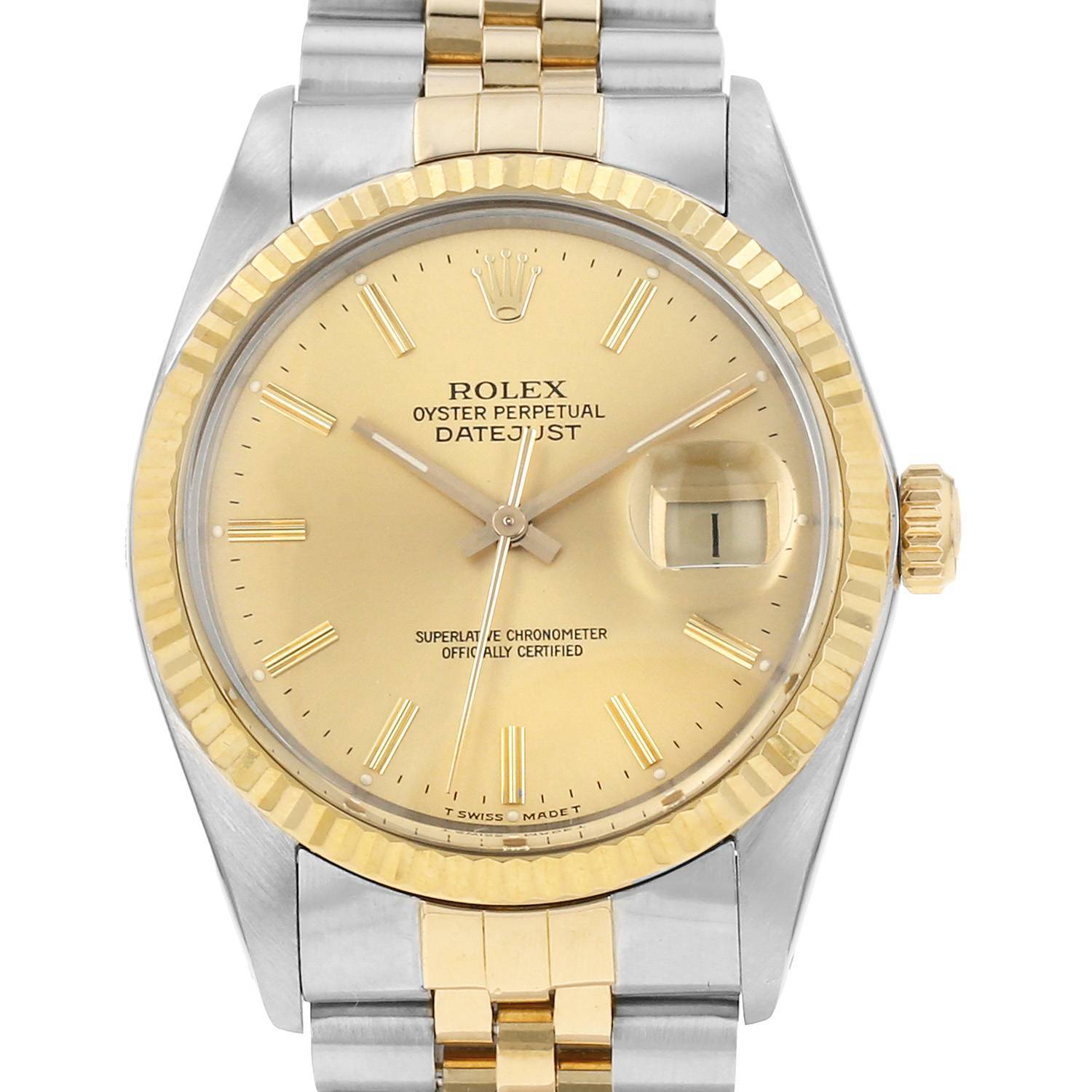 Montre bracelet Rolex Datejust en or et acier. Boitier rond en acier, fond vissé, lunette striée en or blanc, couronne vissée. Cadran argenté, mouvement automatique. Index cerclés luminescents, aiguilles droites luminescentes. Trotteuse centrale, dateur par guichet à 3h. Bracelet jubilé en acier signé Rolex, boucle déployante en acier signée Rolex. Cadran‚ boîtier et mouvement signés. Vendu avec écrin d’origine Rolex, papiers d’origine Rolex. Très bon état: cadran, verre et aiguilles en très bon – CS