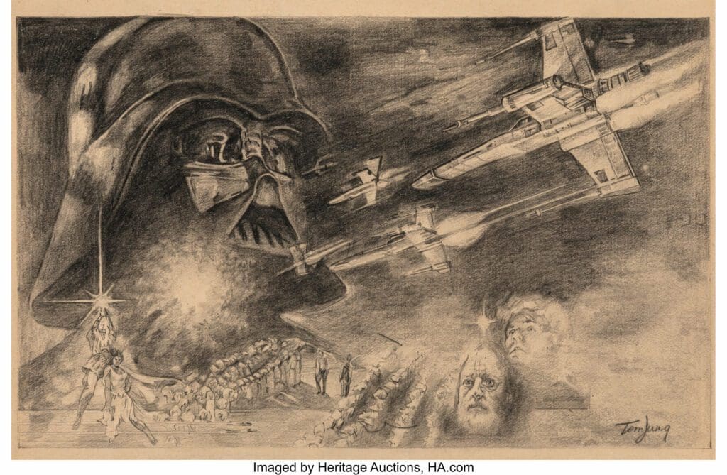 En parlant de Star Wars, cette vente contient également l’affiche du premier volet de la saga sans fin réalisée au crayon par l’artiste Tom Jung. Dark Vador se profile au-dessus d’un paysage où figurent Obi-Wan Kenobi, Luke Skywalker et d’autres moments emblématiques du space opera de George Lucas.